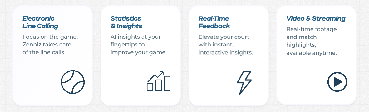 Zenniz is a next-generation smart-court system that brings AI analytics, electronic line-calling, and pro-level video technology directly to your tennis court. Zenniz combines advanced sensors and an HD camera installed at the net to capture ball impacts, player movement, turning action into live data and video highlights.